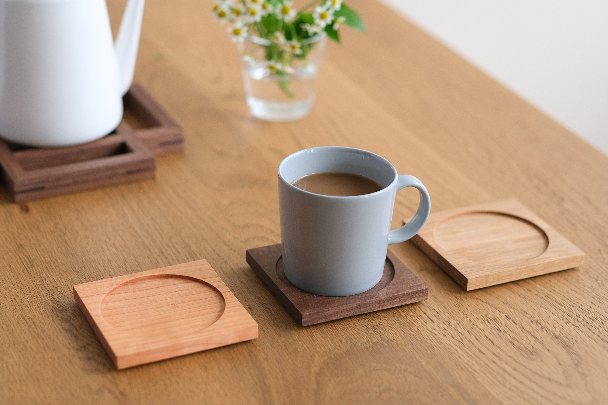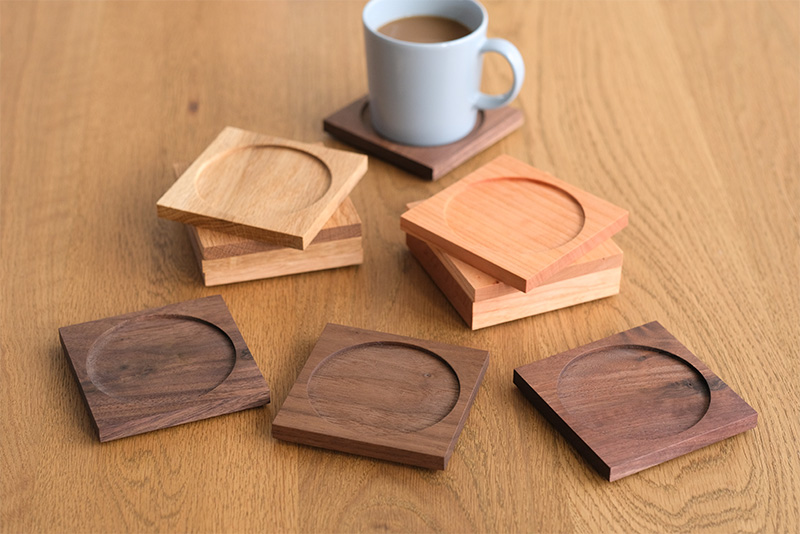 樹木の質感が、ナチュラルで気持ちいい。額縁や家具の製造過程で生じた端材を使用した、オリジナルコースター。
